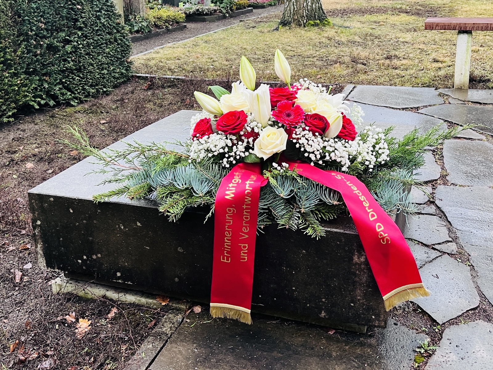 Nach der Ansprache und weiterführenden Worten von Stadtrat Dr. Peter Lames legten wir einen Kranz nieder. Die Besucher legten weiße Roten auf dem Grabstein ab und gedachten der Opfer still.